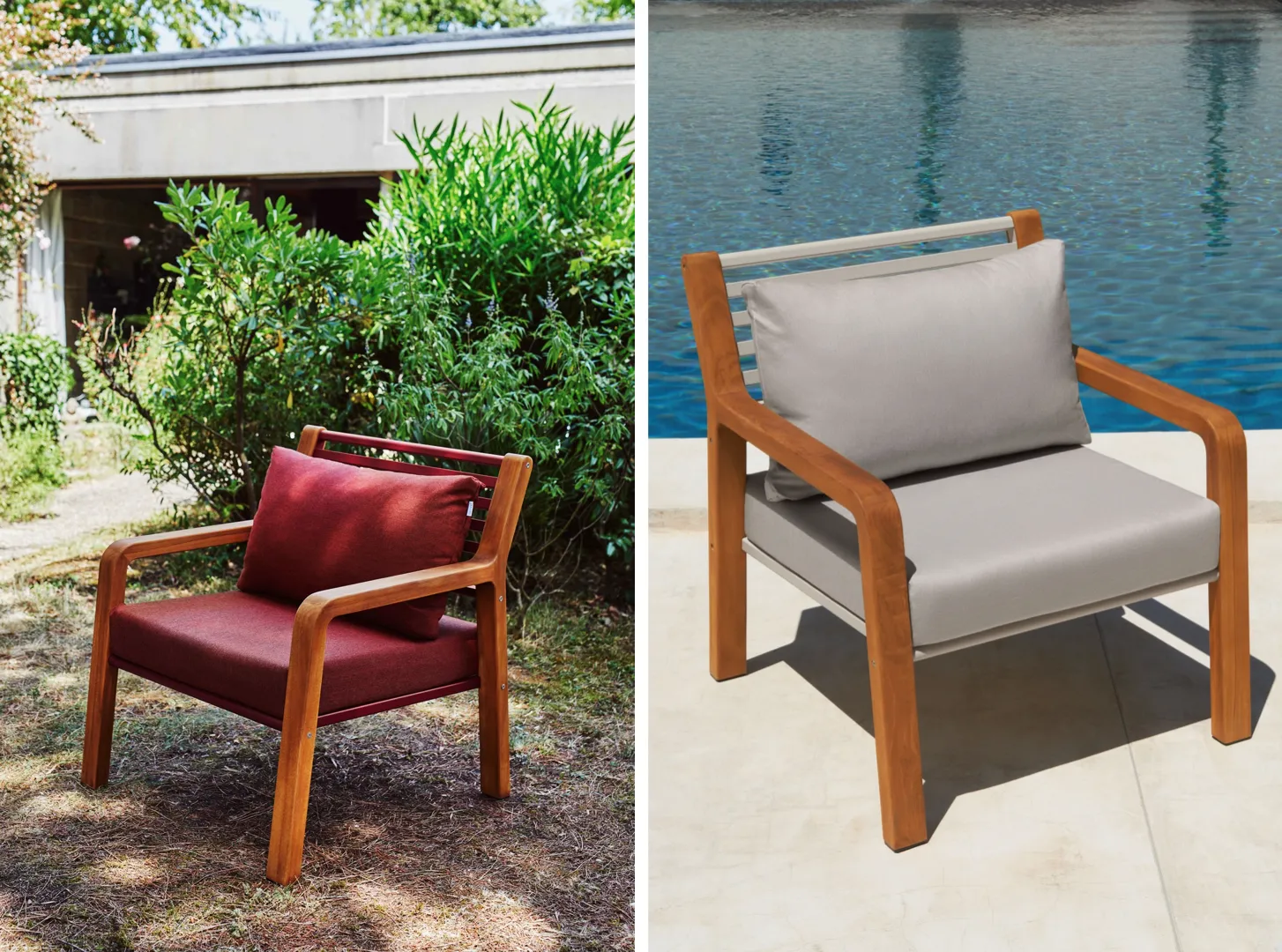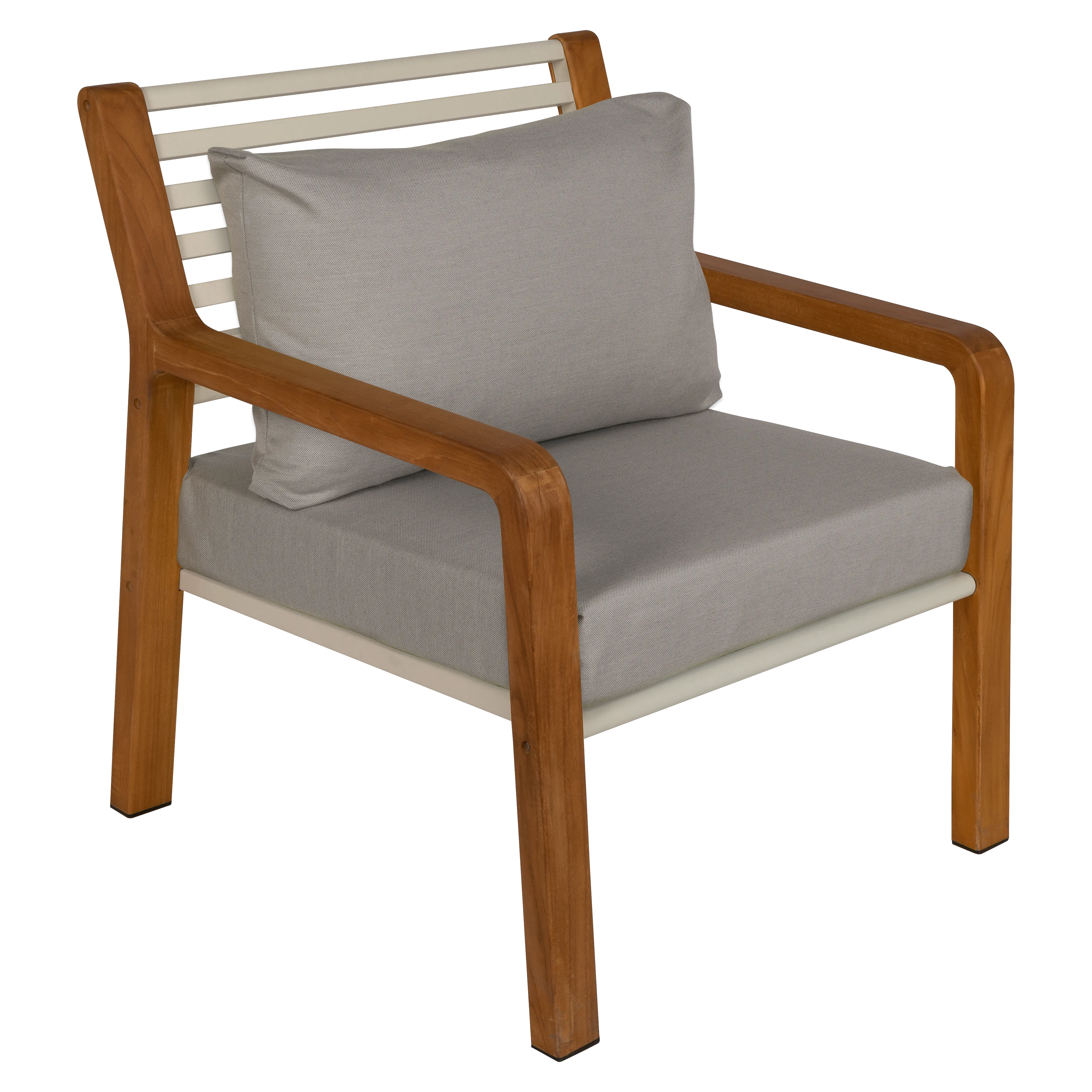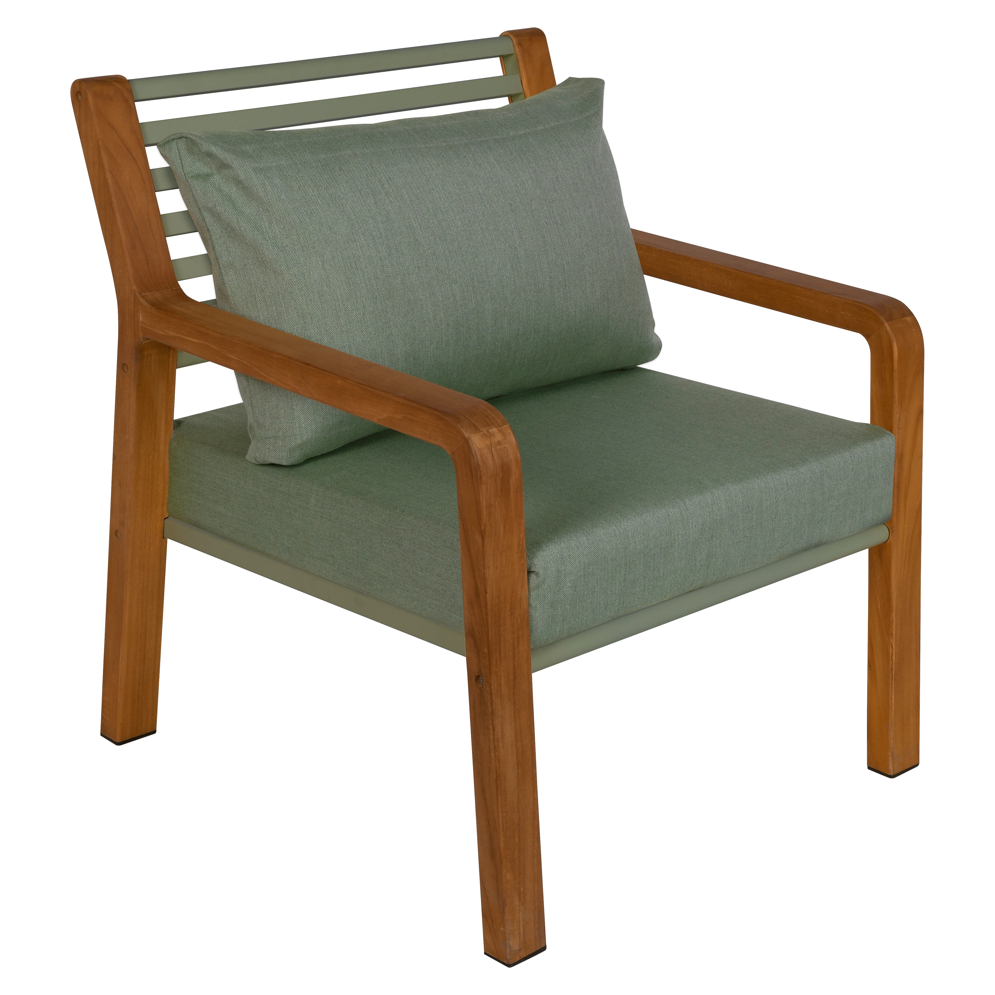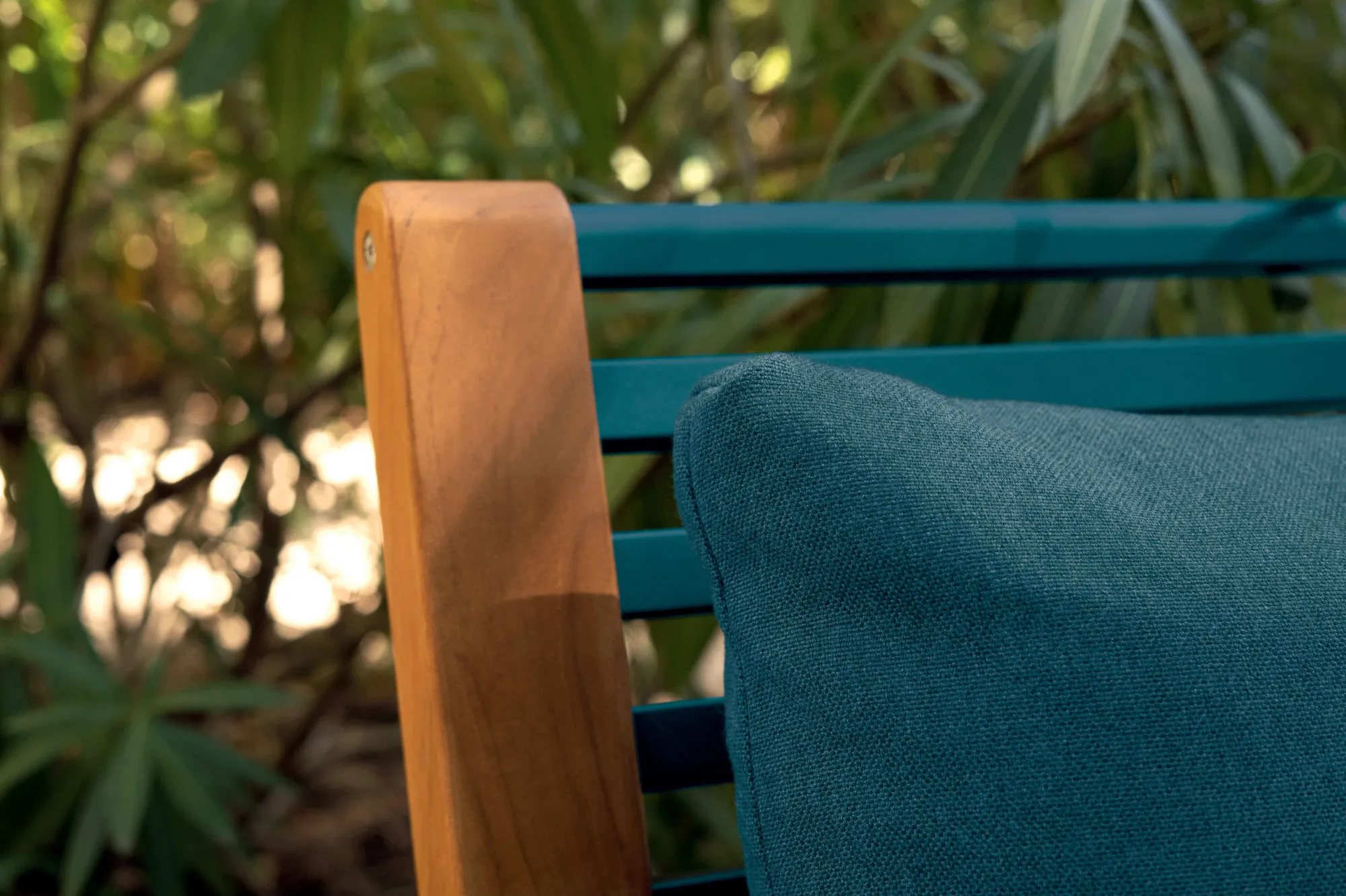 Teak frame. Perforated aluminium sheet seat. Tubular aluminium backrest. Teak armrests. Solution-dyed acrylic Sunbrella® fabric. High resilience polyurethane foam