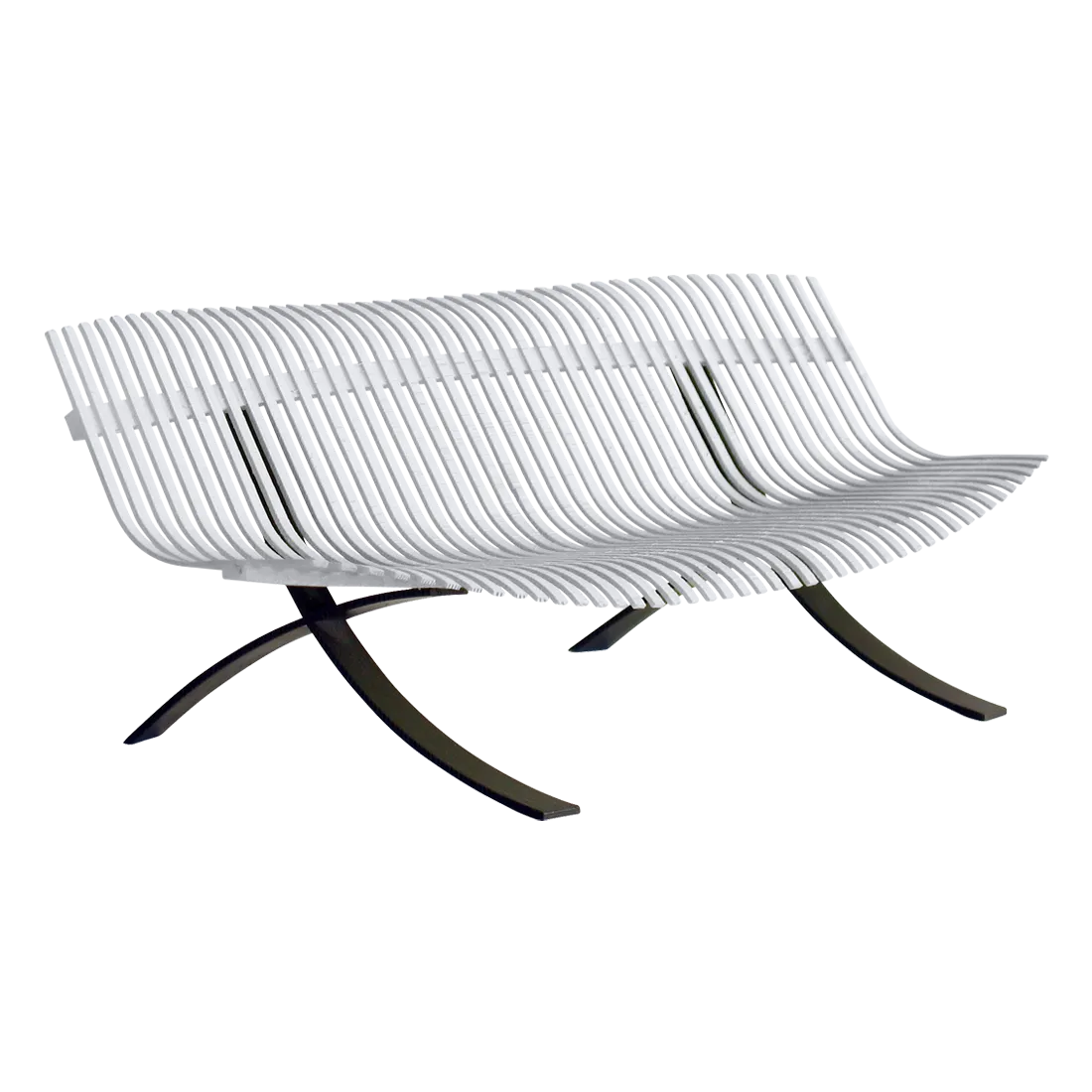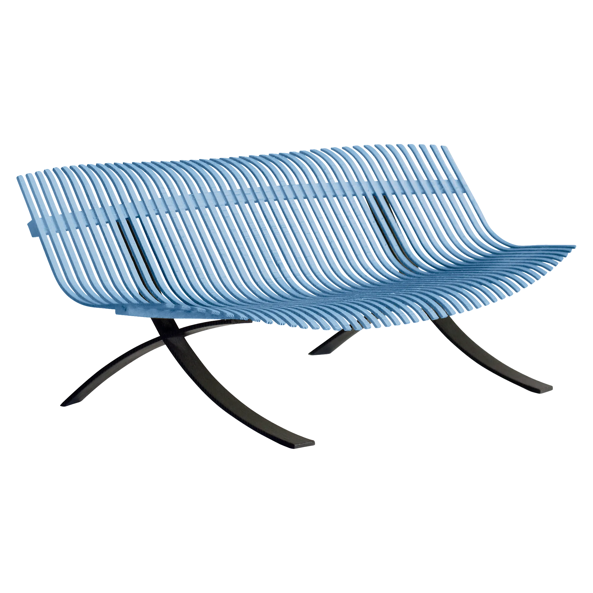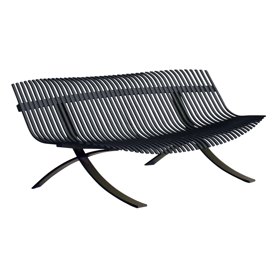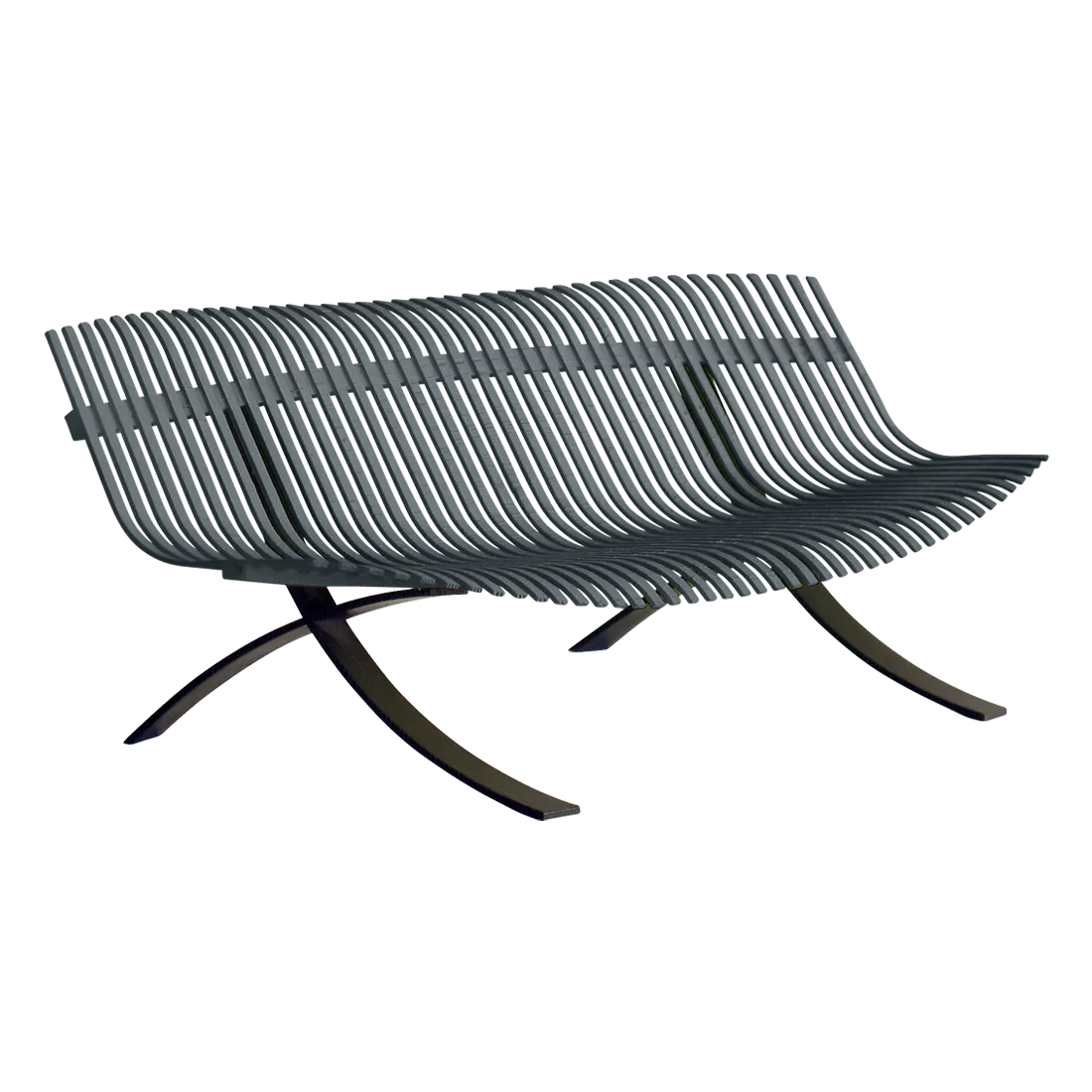 Curved aluminium flat seat Curved aluminium flat backrest Liquorice steel base Delivered assembled