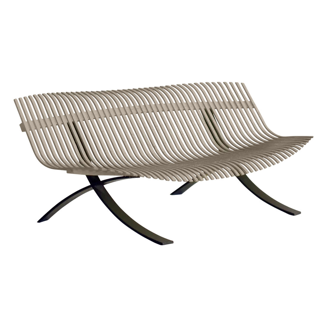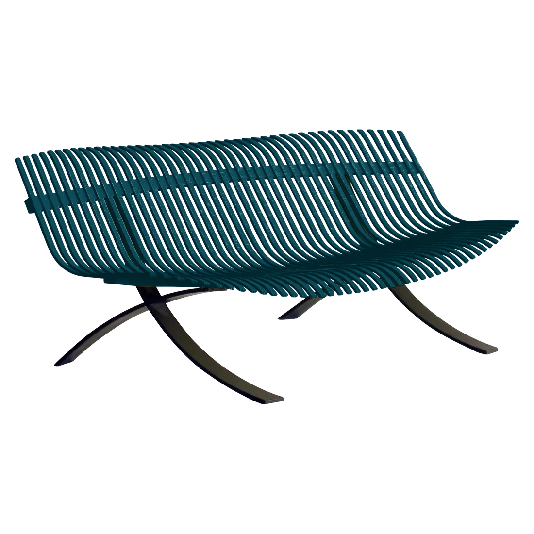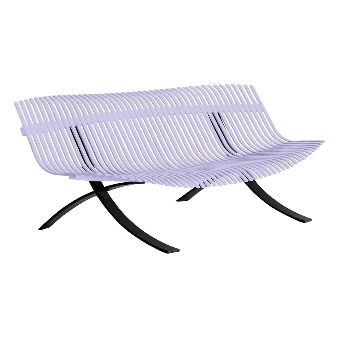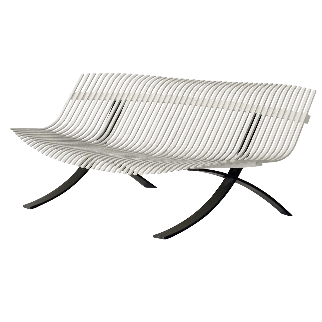 Curved aluminium flat seat Curved aluminium flat backrest Liquorice steel base Delivered assembled