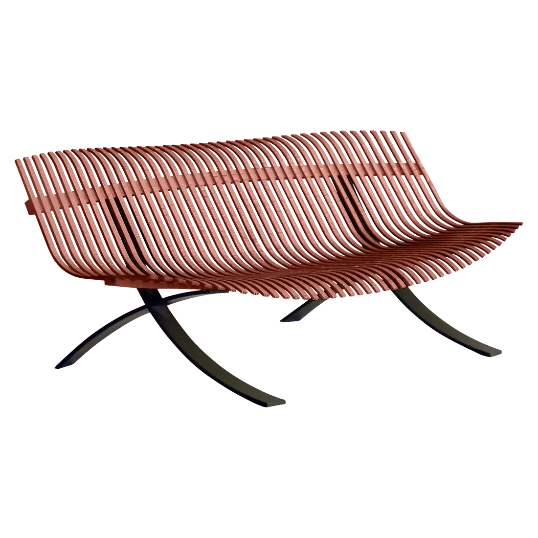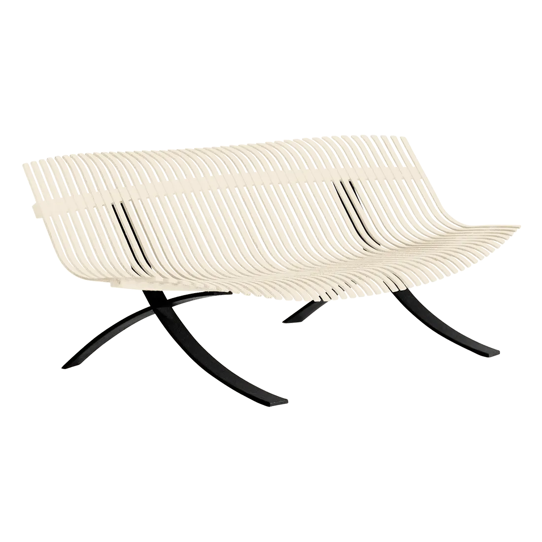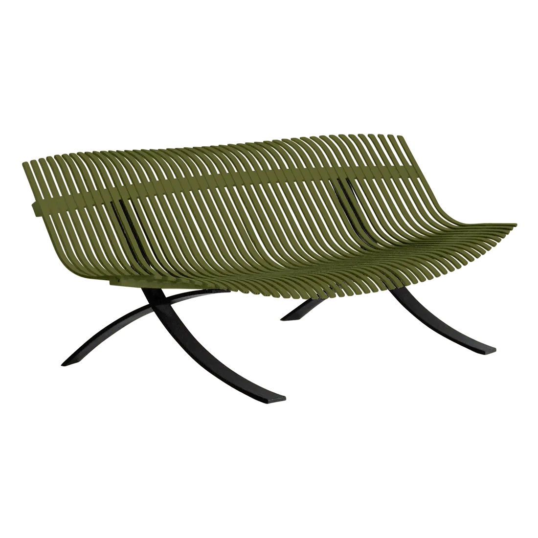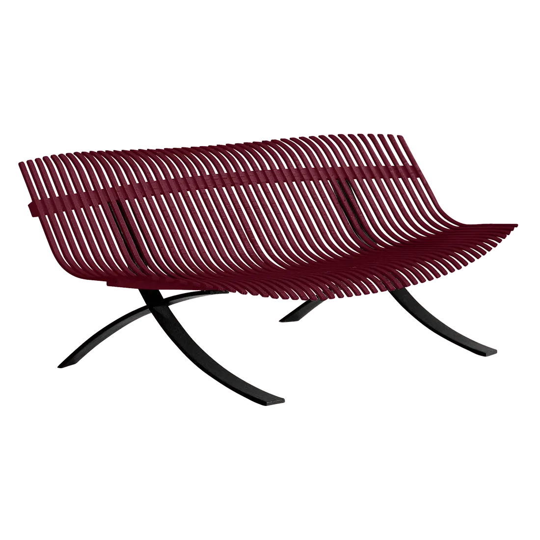 Curved aluminium flat seat Curved aluminium flat backrest Liquorice steel base Delivered assembled