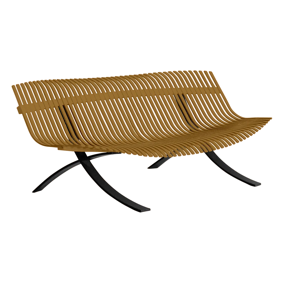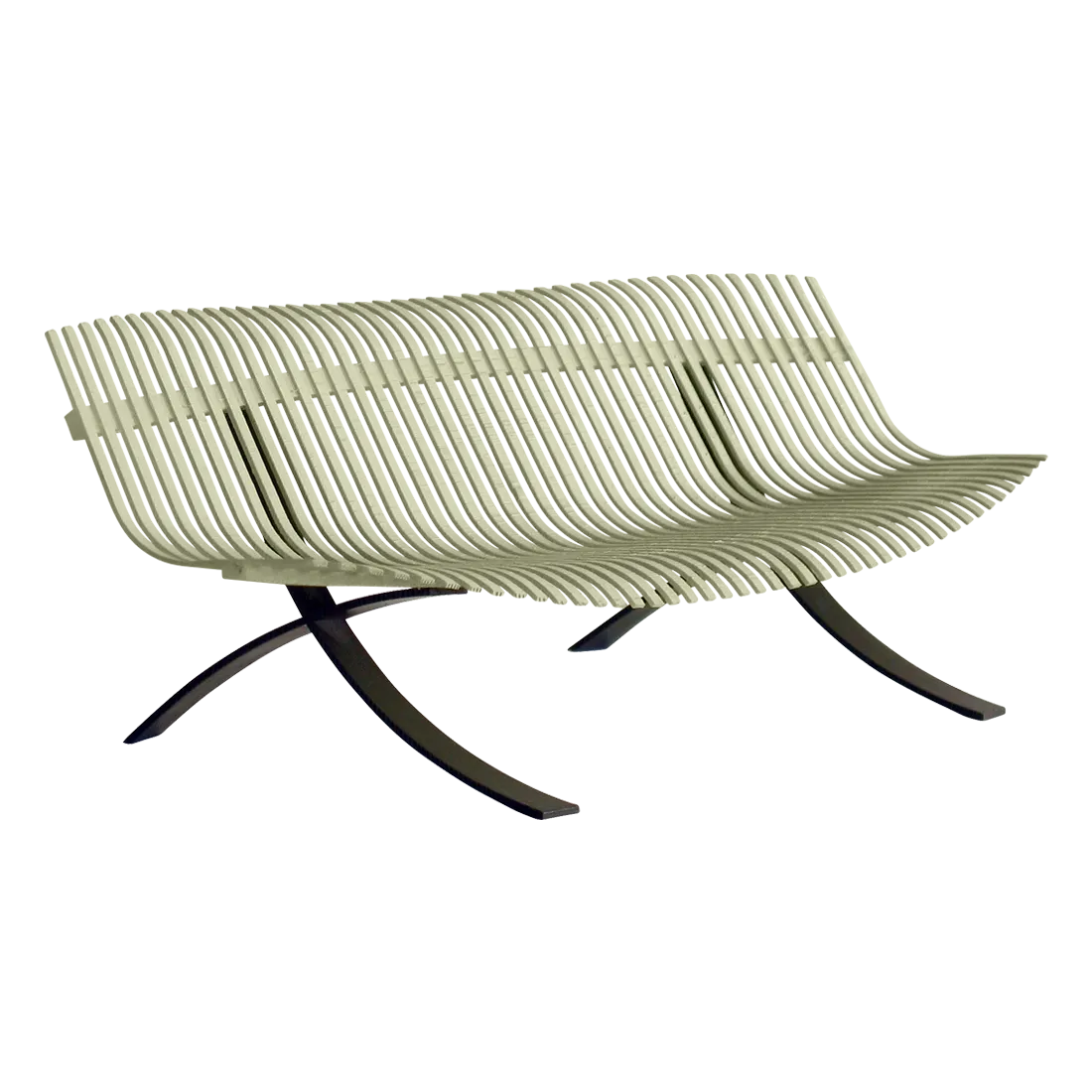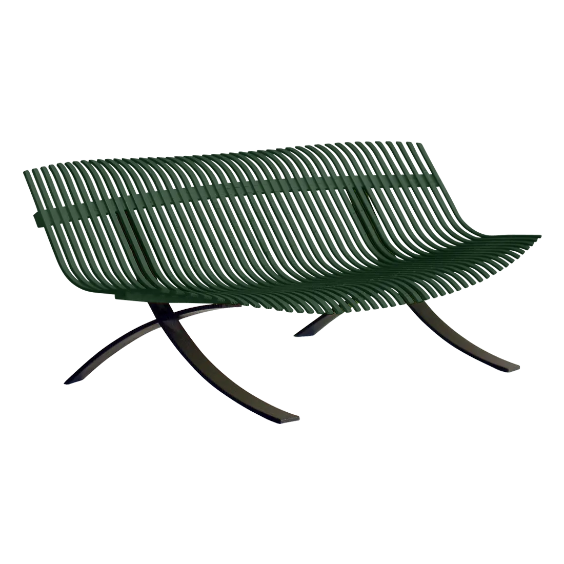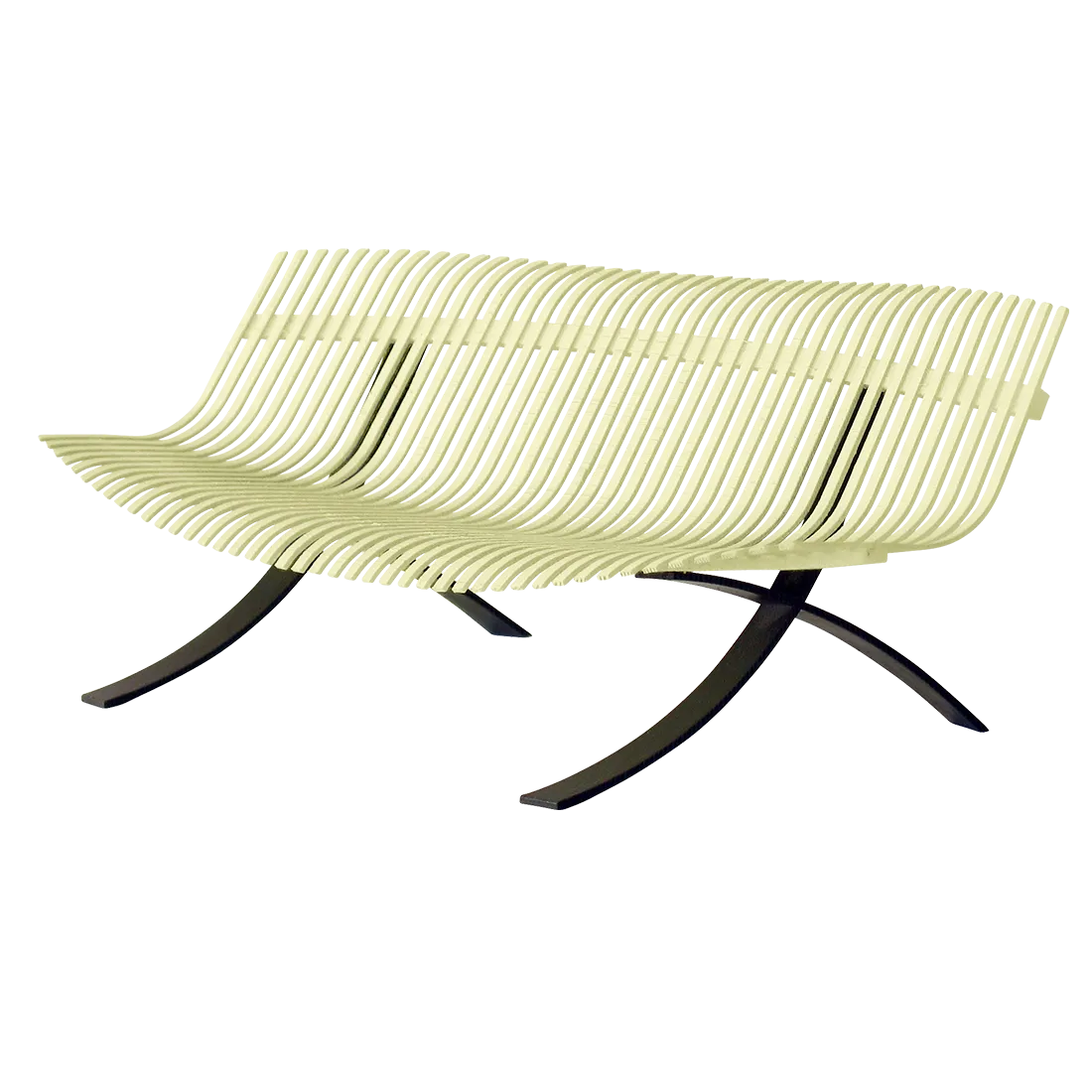 Curved aluminium flat seat Curved aluminium flat backrest Liquorice steel base Delivered assembled