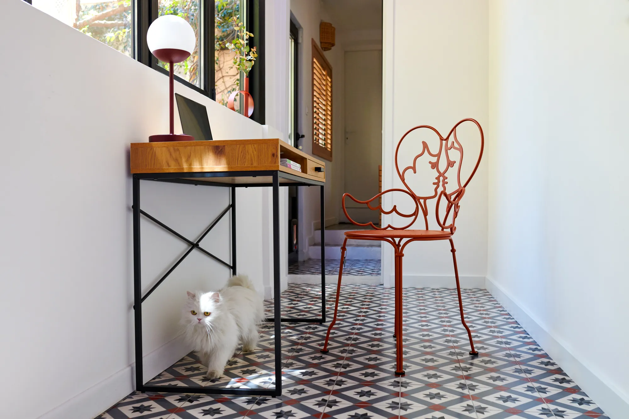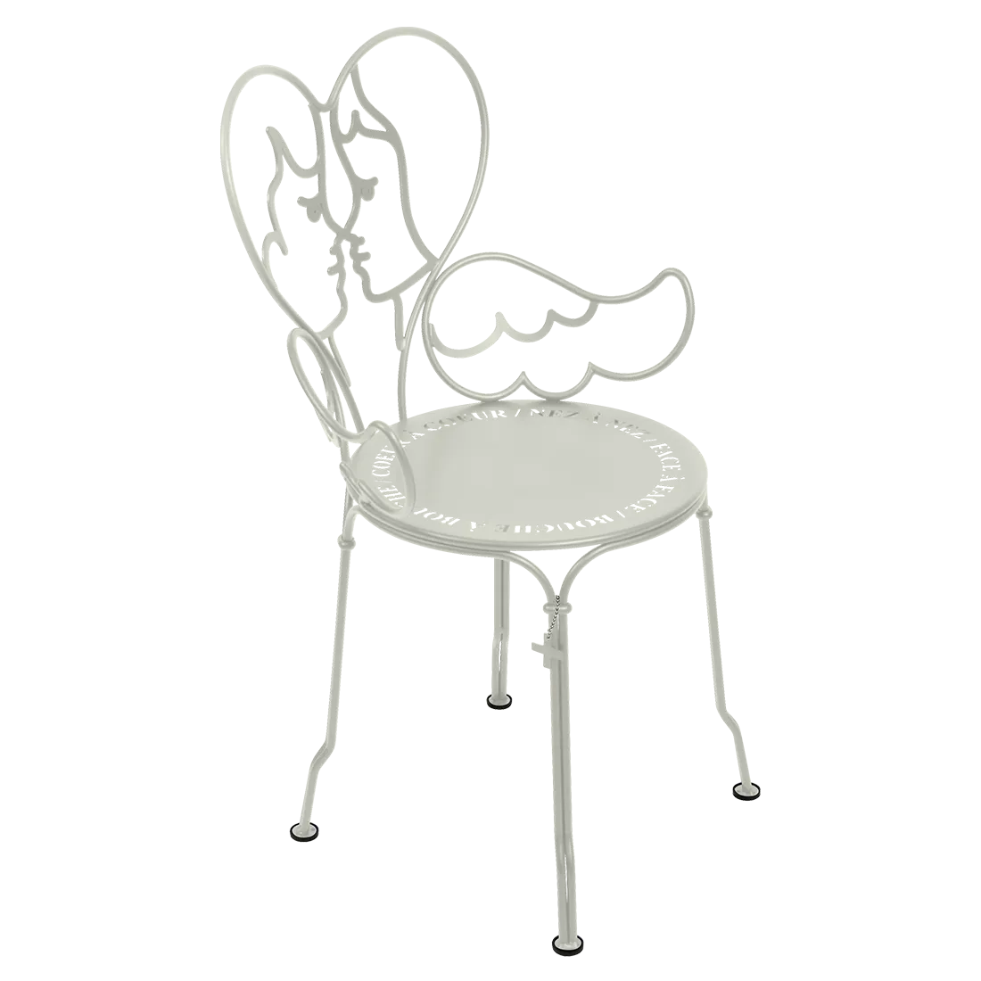 Steel wire frame . Perforated steel sheet seat . Steel wire backrest . Steel wire armrests