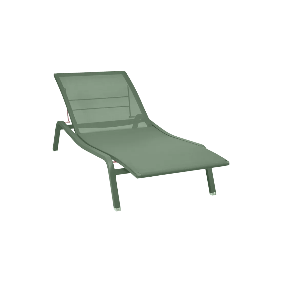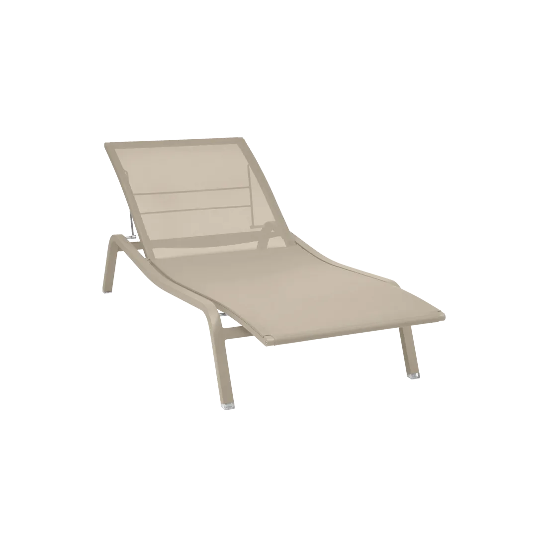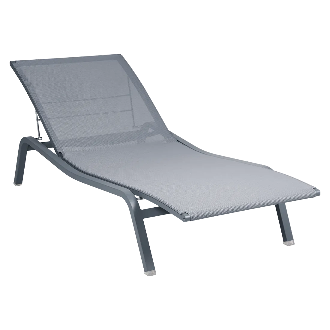 Tubular aluminium frame . Duo or Stereo OTF Batyline® outdoor fabric bed – high-tenacity . 100% polyester thread coated in solution-dyed PVC. Adjustable backrest 5 positions (0°-20°-30°-38°-45°)+2 foot positions (0°-4°). Integrated wheels. Adjustment system : stainless steel wire