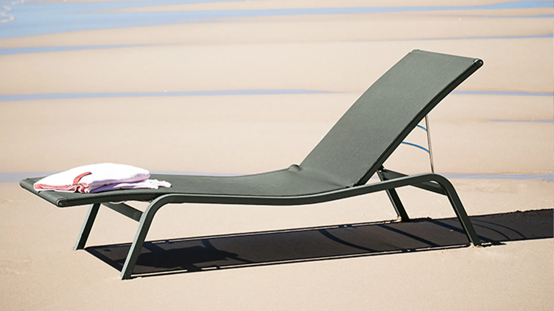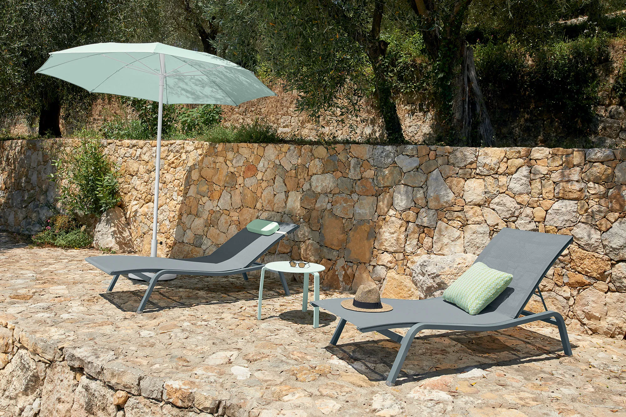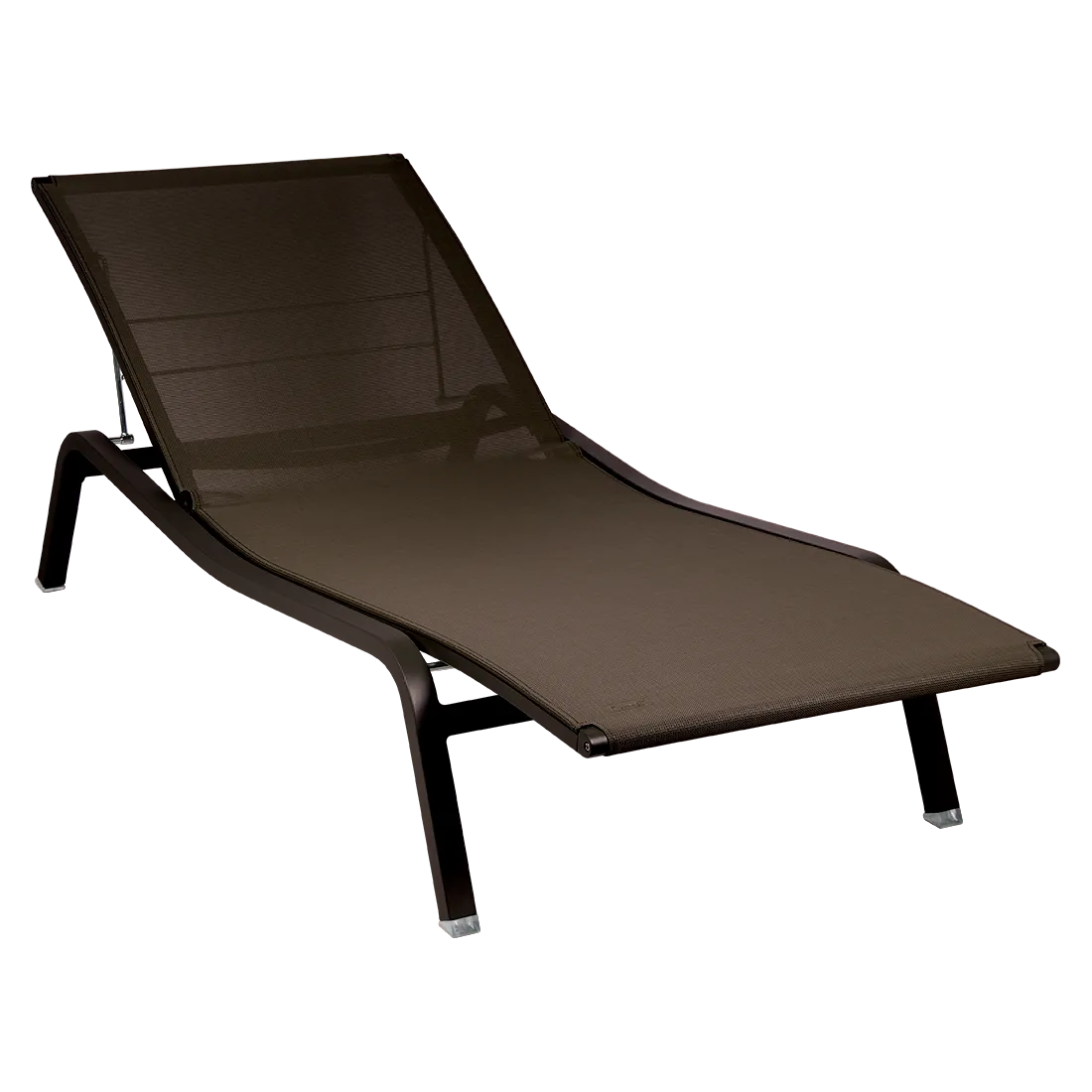 Tubular aluminium frame . Duo or Stereo OTF Batyline® outdoor fabric bed – high-tenacity . 100% polyester thread coated in solution-dyed PVC. Adjustable backrest 5 positions (0°-20°-30°-38°-45°)+2 foot positions (0°-4°). Integrated wheels. Adjustment system : stainless steel wire